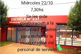 El reclamo fue plasmado en un comunicado que cita la “profunda preocupación por la situación que atraviesa la institución ante la falta de personal de servicio (portera), luego de que el Consejo General de Educación dejara sin trabajo a la señora Paula, quien se desempeñó en la escuela durante cinco años con compromiso, responsabilidad y dedicación. Su desvinculación generó graves dificultades en la limpieza, el mantenimiento y la higiene del edificio escolar, condiciones indispensables para el bienestar y la seguridad de los estudiantes, docentes y familias. Por todo ello, solicitamos la inmediata reincorporación de la señora Paula a su puesto de trabajo, en reconocimiento a su trayectoria y en defensa de los derechos laborales de una trabajadora que forma parte fundamental de nuestra comunidad educativa”.