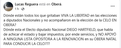 “Dónde están todos los que gritaban VIVA LA LIBERTAD en las elecciones a diputados Nacionales y no acompañaron en la elección de la CELO EN OBERA? Dónde está el Electo diputado Nacional DIEGO HARTFIELD, que habla de achicar el estado y bajar impuestos, por ende servicios, y NO APOYÓ A NINGUNA LISTA OPOSITORA A LA RENOVACION en su OBERA NATAL PARA CONDUCIR LA CELO???”, preguntó Reguera.