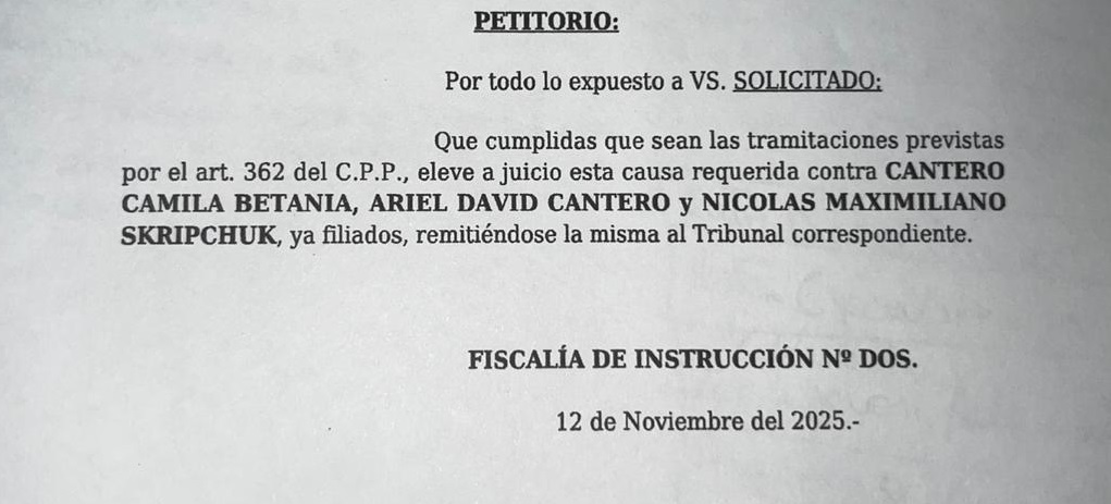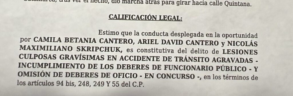 La fiscal Myriam Estela Silke requirió la elevación a juicio. Los policías imputados son el oficial subayudante Nicolás Maximiliano Skripchuk, el sargento primero Ariel David Canteros y la agente Camila Betiana Canteros. La víctima padeció lesiones gravísimas que derivaron en discapacidad permanente