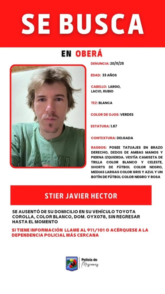 Javier Héctor Stier (33) está desaparecido desde el miércoles por la noche, según denunció su pareja ante la Seccional Segunda de Oberá. Contó que el hombre salió en su coche para jugar al fútbol en cancha del club Panorámica y luego tenía una cena.