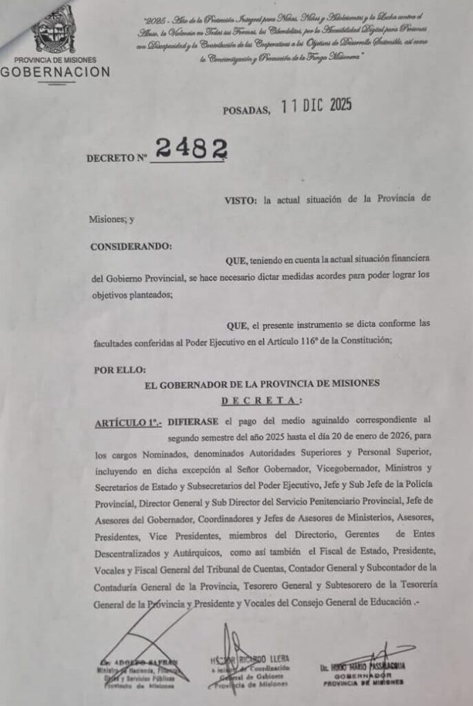 Atento a la actual situación financiera, el gobernador Hugo Passalacqua firmó un decreto que difiere para enero el pago del aguinaldo a los funcionarios con cargos políticos, autoridades superiores y personal de puestos jerárquicos.