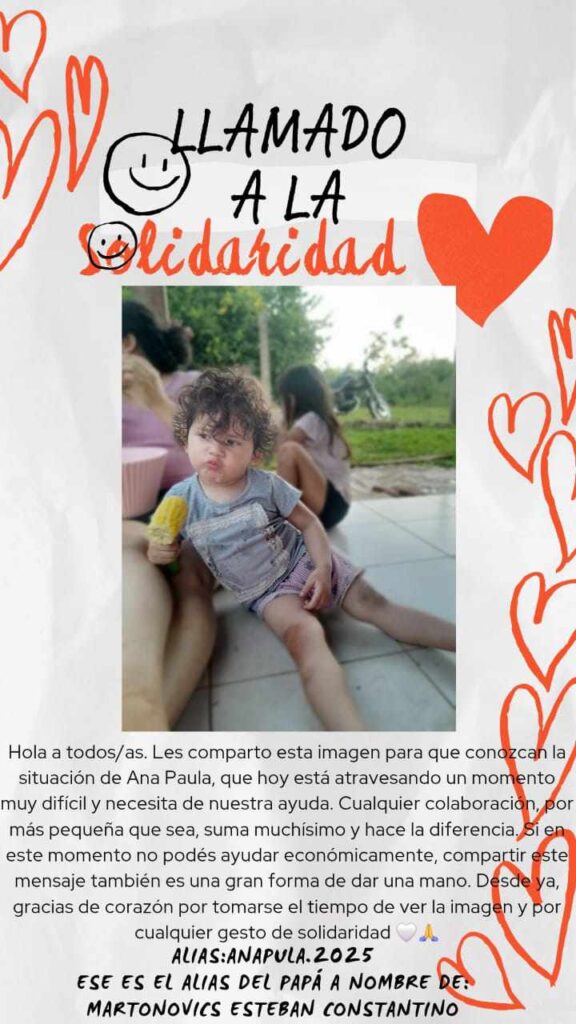 “Queremos que Ana Paula esté mejor, que puede correr y jugar sin dolores, para eso necesitamos de la solidaridad y toda ayuda es bienvenida”, mencionó. La colaboraciones pueden canalizarse a través del alías: anapula.2025