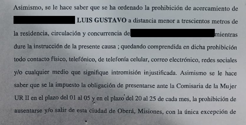 En concreto, se dispuso la prohibición de acercamiento a 300 metros de la víctima y su familia. La medida implica la restricción de contacto físico, telefónico, por correo electrónico y redes sociales.