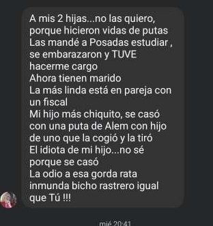 Asimismo, a varias personas que la critican por su accionar descarado, la jubilada se contactó por privado para insultarlos y amenazarlos.