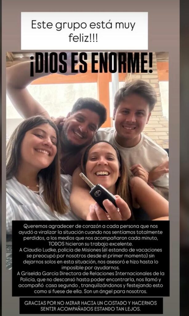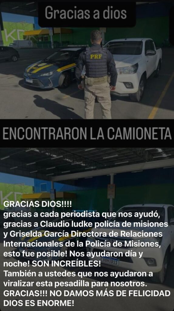 Tras la recuperación del vehículo, Giuliana Vargas, una de las jóvenes damnificadas, compartió un agradecimiento a través de sus redes sociales: “Gracias a Claudio Ludtke de la Policía de Misiones y Griselda García, de la Dirección de Relaciones Internacionales esto fue posible”.