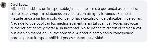 “Michael Kubski, sos un irresponsable, justamente ese día que andabas como loco sobre Picada Vieja circulábamos en el auto con mi hija y lo vimos. Si querés matarte, andá a un lugar solo donde no haya circulación de vehículos ni personas. Nada de lo que publican los medios es mentira, así tal cual fue. Podés provocar cualquier accidente y matar a un inocente. No sé dónde te dieron el carnet a vos, pusieron en manos de un irresponsable. A hacerse cargo como corresponde porque por tu irresponsabilidad, podés cobrarte una vida”, opinó Carol López.