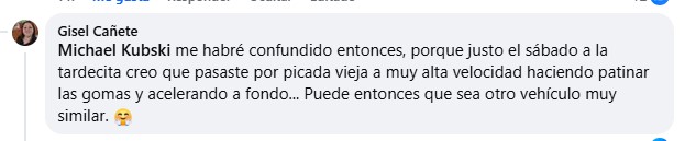En tanto, Gisele Cañete expresó: “Michael Kubski me habré confundido entonces, porque justo el sábado a la tardecita creo que pasaste por Picada Vieja a muy alta velocidad haciendo patinar las gomas y acelerando a fondo… Puede entonces que sea otro vehículo muy similar”.