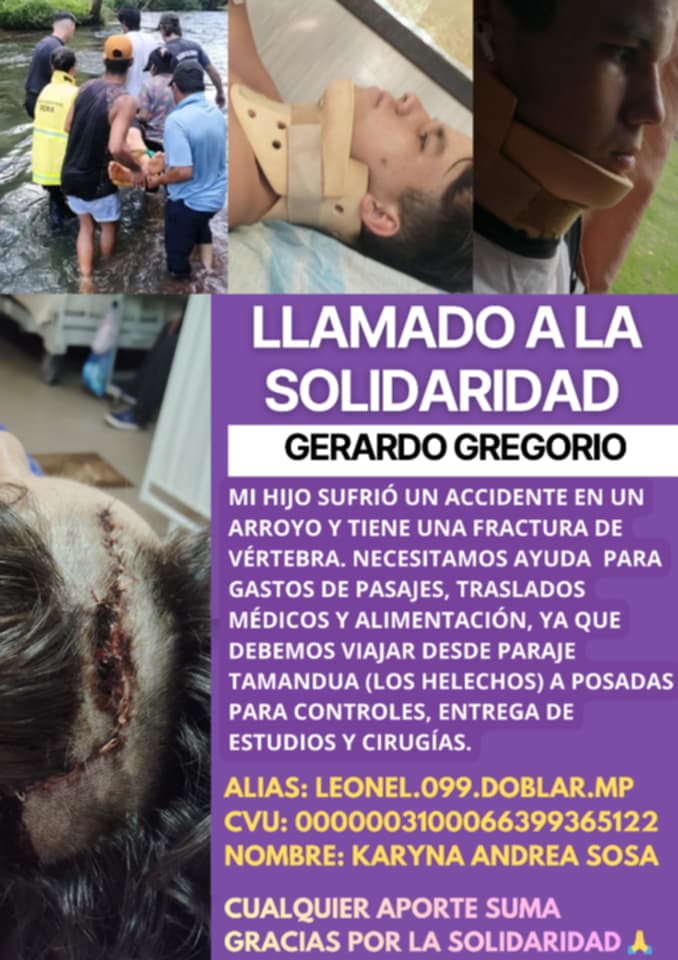 El pasado 29 de noviembre, Gerardo Gregorio (17) padeció una grave lesión de columna que demandó más de un mes de internación en el Hospital Madariaga de Posadas. Actualmente continúa con tratamiento ambulatorio y su familia requiere ayuda para afrontar gastos de traslado y comida, ya que son de condición humilde.