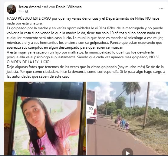 “HAGO PÚBLICO ESTE CASO porque hay varias denuncias y el Departamento de Niñes NO hace nada por esta criatura. Es golpeado por la madre y en varias oportunidades le vi 01hs 02hs de la madrugada y no puede volver a la casa si no vende lo que la madre le da, tiene tan solo 10 añitos y si no hacen nada en cualquier momento será otro caso Lucio. La muni lo que hace es mandar al psicólogo a esa mujer, mientras a él y a sus hermanitos los encierra con su golpeadora. Parece que están esperando que aparezca sus cuerpitos en algún descampado para que recién se muevan. A esta mujer ya le sacaron un hijo por maltratos, la municipalidad lo que hizo fue devolverle porque ella va al psicólogo supuestamente. Siendo que cada vez aparece más golpeado. NO SE OLVIDEN DE LA LEY LUCIO. Dejo algunas fotos que tenemos de las veces que lo vimos golpeado (hay mucho más). Se ríe de la justicia. Por que como ciudadana hice la denuncia como correspondía. Si le pasa algo hago cargo a las autoridades que saben de este caso”.