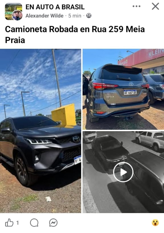 «Camioneta Robada en Rua 259 Meia Praia», publicó el obereño en la página de Facebook EN AUTO A BRASIL. Asimismo, el damnificado radicó la denuncia policial.