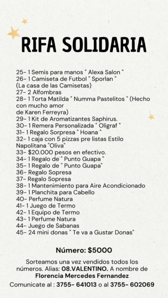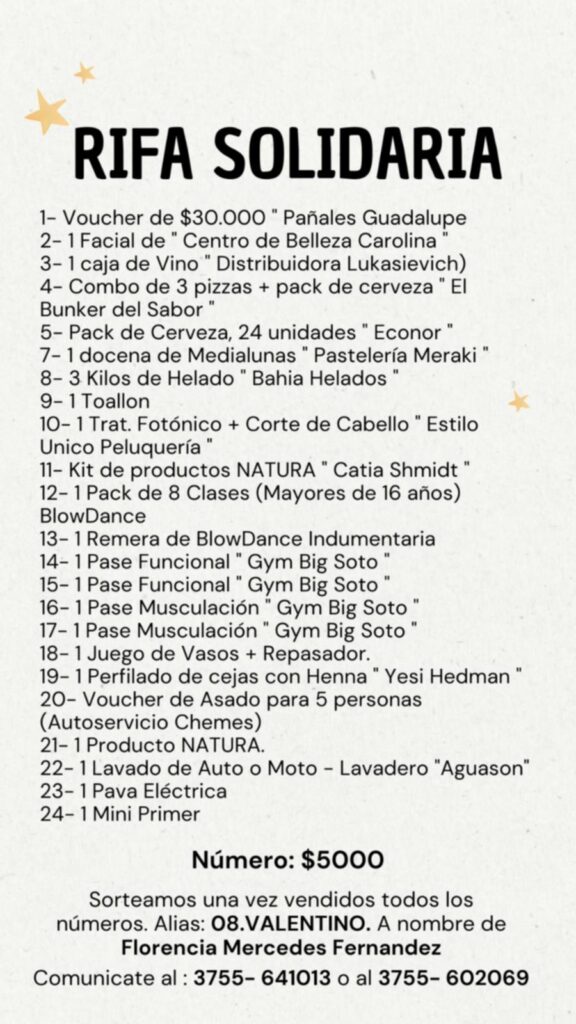 Respecto a la rifa, la misma otorgará 45 premios y tiene un costo de 5000 pesos cada número. Los interesados, pueden contactarse a los números 3755 641013 o 602069.