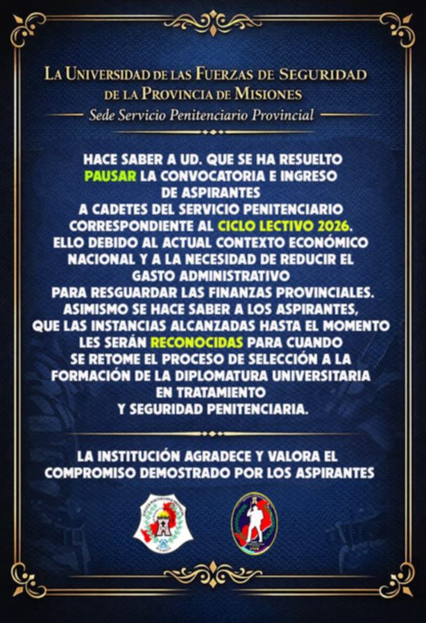 La Universidad de las Fuerzas de Seguridad de la Provincia de Misiones anunció que se decidió pausar la convocatoria e ingreso de aspirantes a cadetes del Servicio Penitenciario Provincial (SPP) correspondiente al ciclo lectivo 2026.